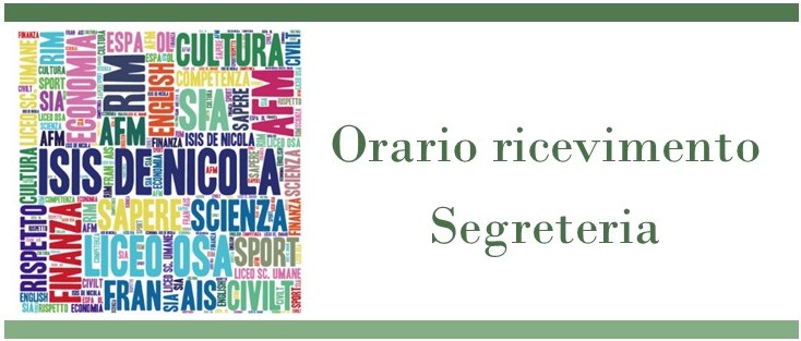 Orario segreteria didattica 2021/2022 Si comunica che lo sportello di ricevimento al pubblico sarà aperto come di seguito indicato: Lunedì – Mercoledì – Venerdì dalle ore 09,00 alle ore 12,00 Martedì dalle ore 13,00 alle ore 15,00 Giovedì dalle ore 14,30 alle ore 16,30